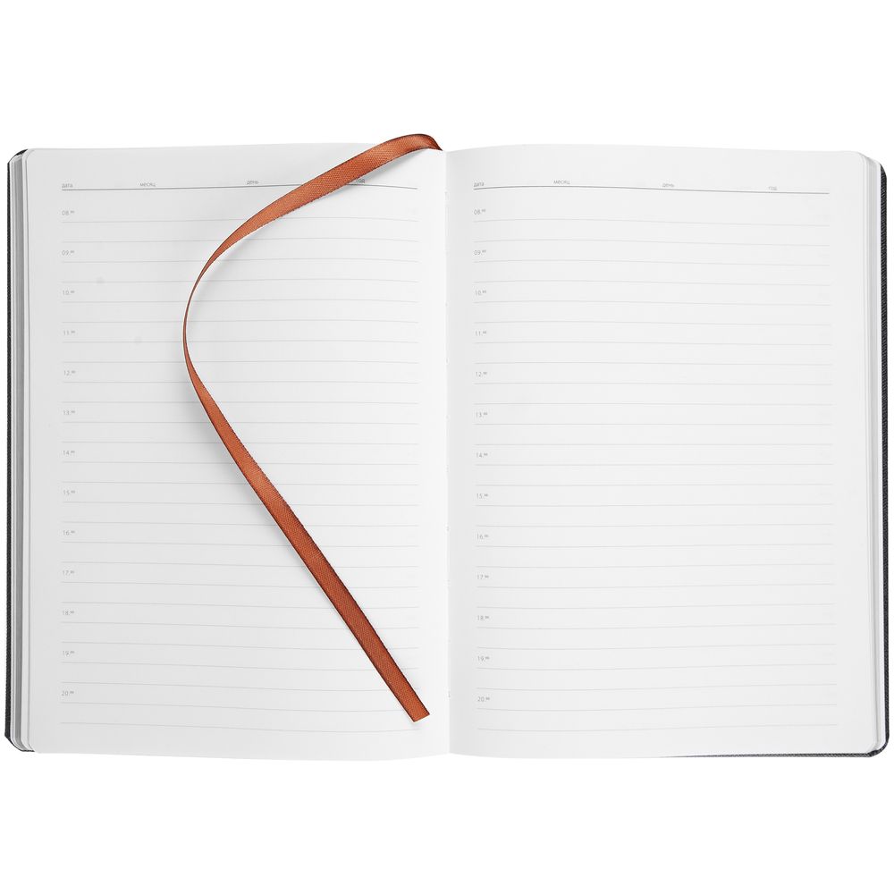 Ежедневник с твердой обложкой и золотистым обрезом, выполнен из материала Saffian, коричневый, дополнен ляссе в цвет обложки.