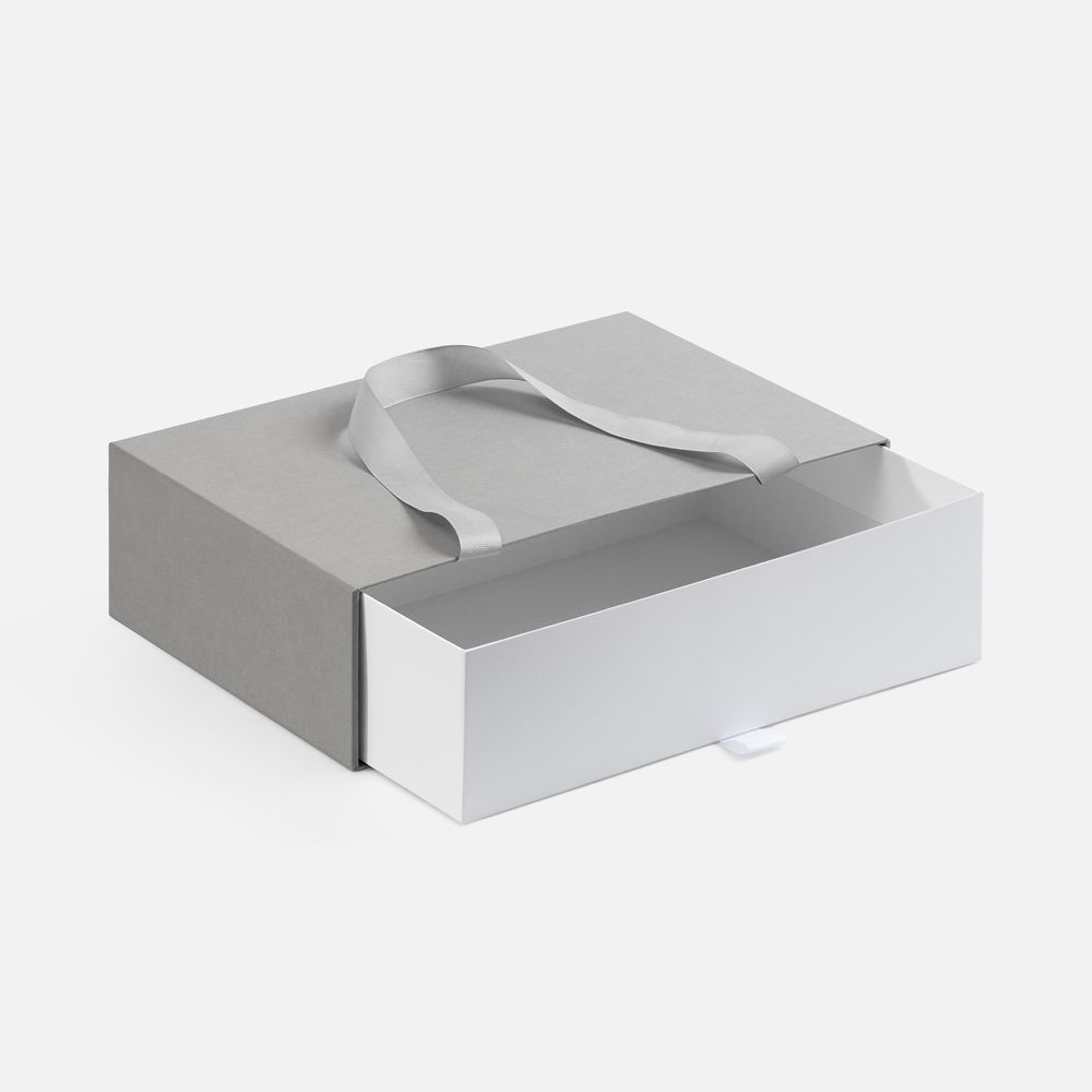 Внешний короб каширован дизайнерской бумаги и оснащен прочными ручками из репсовой ленты. Внутренний короб отделан белой бумагой, ламинированной матовой пленкой.