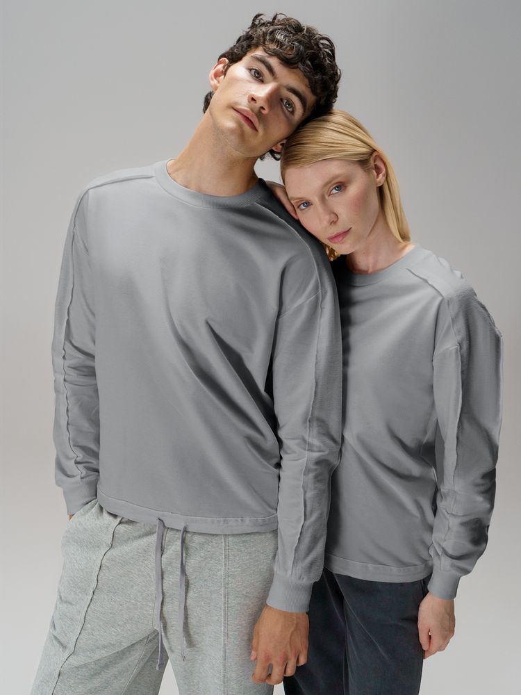 Свитшот унисекс оригинального пошива вдохнет новую жизнь в повседневный гардероб и добавит стильную нотку легкой небрежности в образ. Особая конструкция, где часть деталей — плечи и рукава — вывернута наизнанку, создает необычный притягательный эффект.
